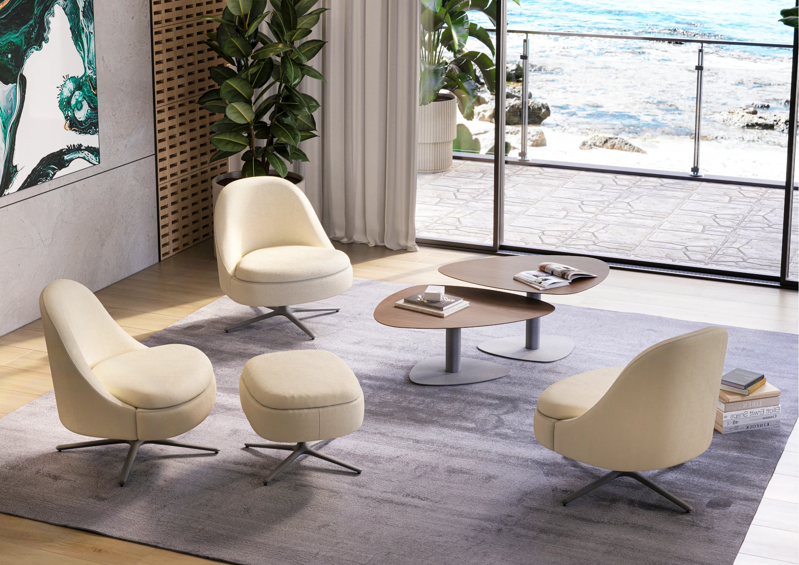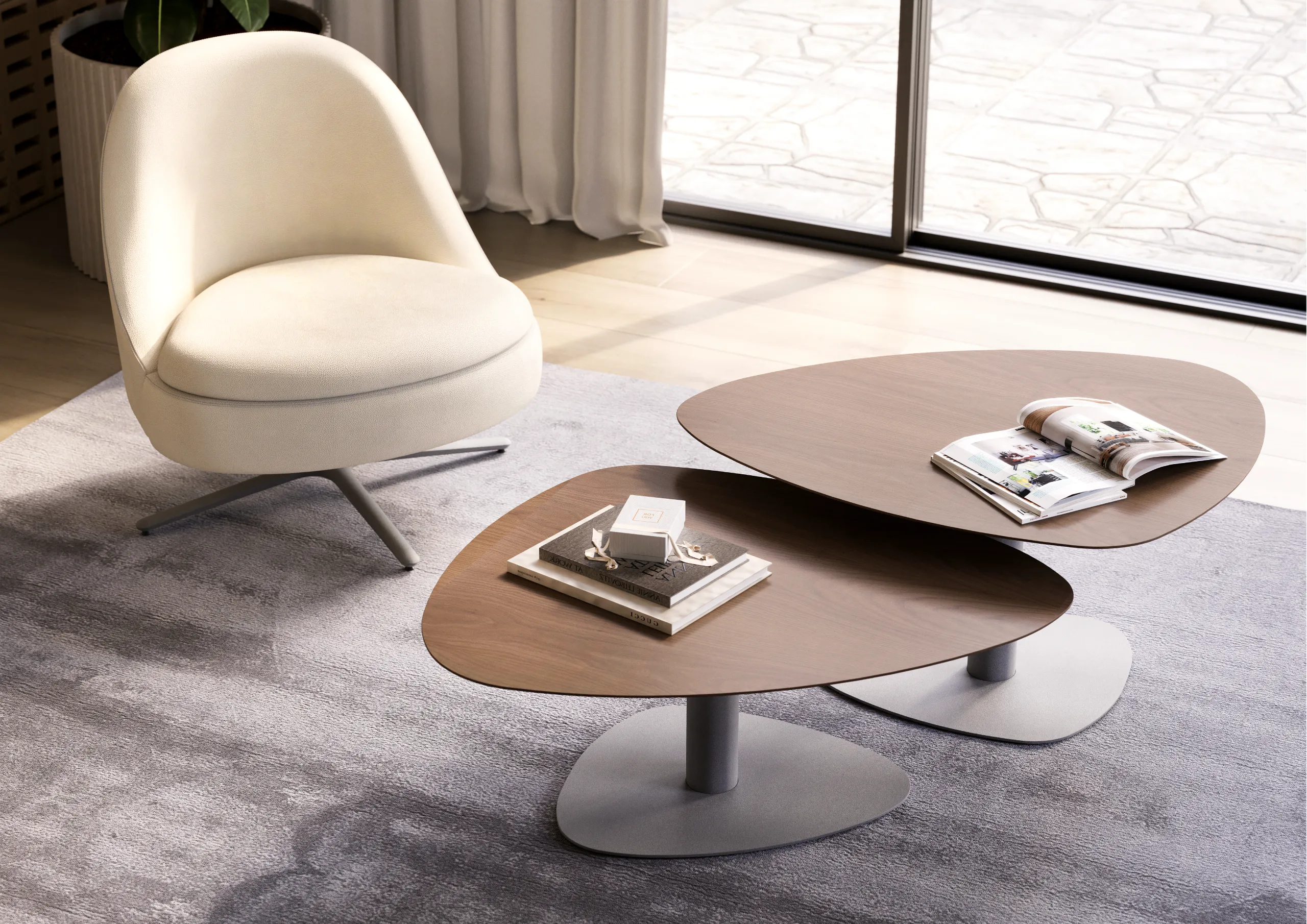 Na Mesa Mia, a base e o tampo, ambos irregulares, ambos diferentes, conversam entre si. Esses, ao serem visualizados em perspectiva, dão origem a arestas perfeitamente simétricas.