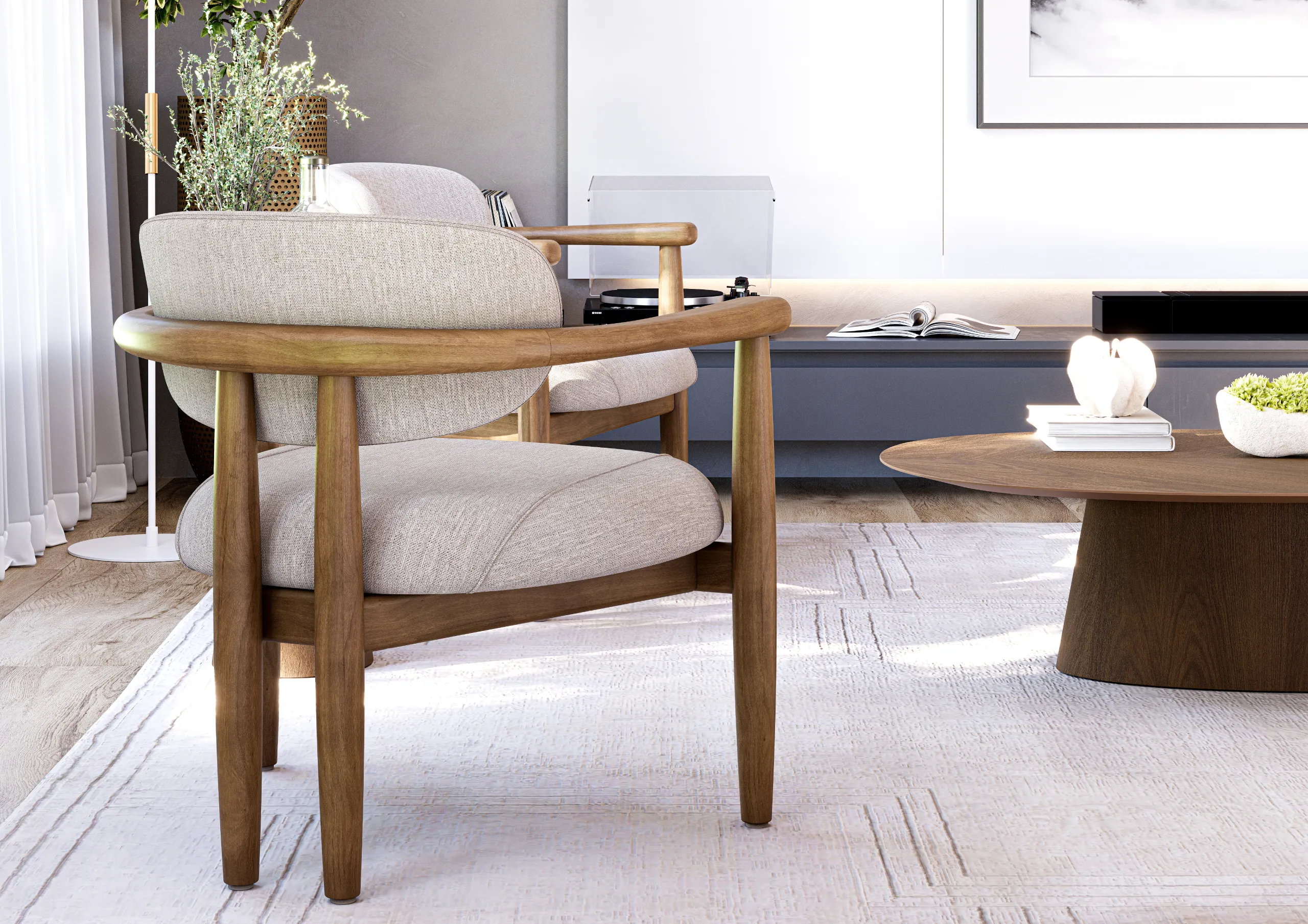 A Poltrona Helena C/ Braços conforto e sofisticação. Com seu braço todo em madeira maciça usinada, harmoniza elegância, robustez e aconchego, tornando-a uma peça versátil para compor diferentes espaços.